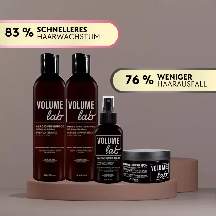 Volume Lab Haarmaske (100 ml): AQUA, CETEARYL ALCOHOL, BEHENAMIDOPROPYL DIMETHYLAMINE, RICINUS COMMUNIS SEED OIL, COCOS NUCIFERA OIL, MACADAMIA TERNIFOLIA SEED OIL, HYDROXYETHYL UREA, LACTIC ACID, BENZYL ALCOHOL, SODIUM BENZOATE, QUATERNIUM-80, POTASSIUM SORBATE, HYDROLYZED SOY PROTEIN, HYDROLYZED WHEAT PROTEIN, D-PANTHENOL, GLYCOLIC ACID, GLYCERIN, PEG-7 GLYCERYL- COCOATE, LAURYL GLUCOSIDE, CAPRYLYL/CAPRYL GLUCOSIDE, BIOTIN, FRAGRANCE, PROPYLENE GLYCOL, PHENOXYETHANOL, PROPANEDIOL, ARGININE, GLYCINE SOJA GERM EXTRACT, TRITICUM VULGARE GERM EXTRACT, GLUCONOLACTONE, CALCIUM GLUCONATE.